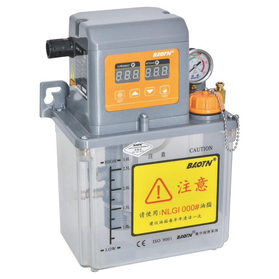 4,系统时间可设定,LUB润滑时间:1~999(秒)INT间歇时间:1~999(分)。特殊要求可订制,面板指示灯可显示出注油机的润滑和间歇状态。